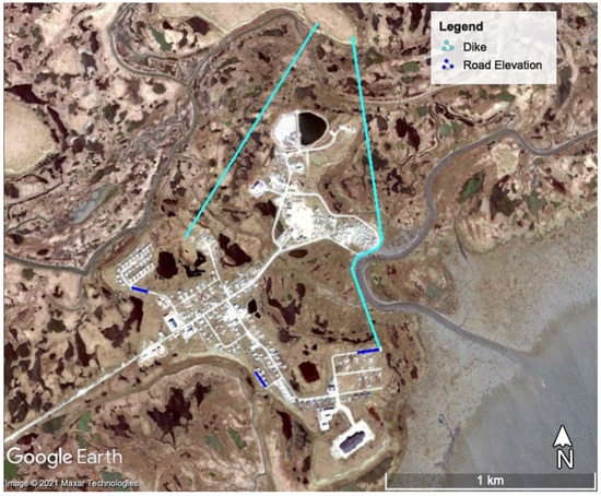 Aside from elevating roads, communities may take any number of steps to provide flood protection. Flood evaluations for Shishmaref [13] compare community relocation to a new site to co-location with an existing community or creating protective measures at the original site. Relocation might take place all at once, as Newtok is doing in its move to Mertarvik, or in a staged retreat, when the community plans new infrastructure on nearby high ground while abandoning or demolishing threatened structures in a slow migration. Other options for site protection include elevating homes, creating dikes, or bolstering natural protective features at the site.