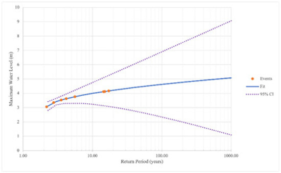 Extreme value analysis was conducted following Goda’s method [19] to determine the return period of the nine storms. The return period provides the likelihood that a flood of a particular extremity will occur in a given year; for example, a 100-year flood would have a 1/100 chance. Alternatively, the return period can be considered the recurrence interval, which is the expected average time between storms of that magnitude. It is expected that at least one storm of that magnitude occurs within the return period. There are several notes that should be mentioned in this application. First, extreme value analysis is a statistical analysis that is dependent upon sample size; the smaller the sample size, the larger the possible variability and resulting confidence interval. With limited flood data, we are necessarily limited to a small sample size and will use this as a best first attempt at flood-return period estimation. This limited dataset uses the annual maxima and peak over threshold methods (which have identical techniques). There is also difficulty in shifting the extreme value analysis from waves (Goda’s method) to flooding. This change has an unknown interaction with constants determined by Goda for extreme value analysis of waves using a Monte Carlo analysis; it likely has little effect on the distribution and return-value calculation but does impact the calculation of the confidence intervals of the distribution.