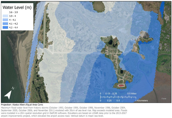 The Yukon-Kuskokwim Delta (YKD) has low elevation and experiences frequent storms, making it particularly vulnerable to storm-surge flooding and climate change impacts. Prior to the mid-1900s mandate that Alaska Native children attend federally regulated schools, Alaska Native communities migrated between the coasts and central Alaska to follow fish and game [9]; following the mandate, permanent coastal habitations were created, sometimes in locations only intended as summer camps. Besides sea level rise, these coastal communities face climatic threats from the effects of melting permafrost, salinization, erosion, and changing ecosystems impacting a subsistence-based lifestyle. Terenzi et al. found that flooding appears to be more frequent on the YKD than other coastal areas of Arctic Alaska and Canada, probably because of the relatively low elevation (about 2 m relative to mean sea level) and the significant tidal range (2.7 m) [10].