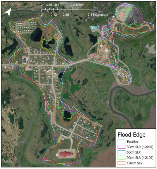 Estimating relocation costs, particularly without a relocation site in mind, is challenging. The USACE has estimated relocation costs for Newtok (pop. 354), Kivalina (pop. 683), and Shishmaref (pop. 576) to be USD150 million, USD270 million, and USD280 million, respectively [21,22]. Assuming that population is the driver for relocation costs, linear interpolation leads to a Hooper Bay (pop. 1375) to be USD690 million—an amount that dwarfs the flood mitigation costs under consideration here.