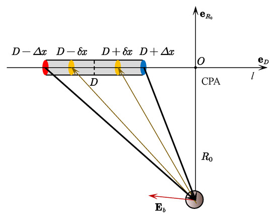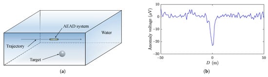 In the AEAD model, as shown in Figure 1, the detection system is assumed to move along trajectory l, with the unit vector , and the target is located at a fixed position. The closest point of approach (CPA) distance can be obtained, where CPA is the closest point from the target to the movement trajectory of the detection system [18]. The vector from the target to the CPA is denoted by , where is the unit vector. Then, a coordinate can be obtained by using the CPA and trajectory l. In the AEAD model, it is assumed that the detection system is placed at point D along a straight-line l. A pair of excitation electrodes and are displaced at () and (), respectively. The electric sensors denoted by and are respectively set at () and () for measuring the perturbation voltage U.