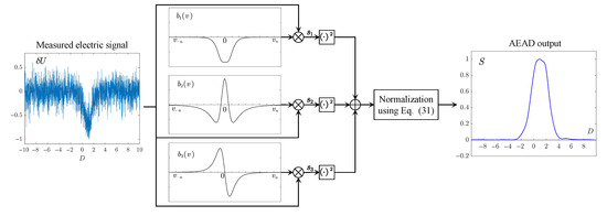 In an actual measurement, the voltage acquired from and are sequentially discrete. As mentioned before, this study assumes that the AEAD system moves along trajectory l and measuring points are set at every m, so . Therefore, M voltage values are obtained . The mth point is regarded as the current point of signal processing. Accordingly, (28) can be rewritten as