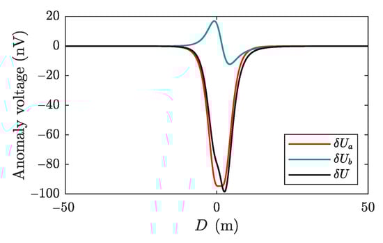The synthetic signal of the electric anomaly is represented by the black line () in Figure 4. As shown in Figure 4, the perturbation voltage (red line, ) of the active electric field differed from the background electric field (green line, ).