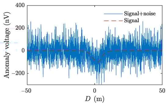 To analyze the proposed AEAD method’s performance, the Gaussian white noise was added to the synthetic signal, as shown in Figure 5. The ratio of the anomaly signal’s instantaneous maximum power to the variance of noise was used to calculate the SNR [21]. In the simulation, the SNR of the noise-containing anomaly signal was dB. Thus, the electric anomaly signal was completely submerged in the noise.