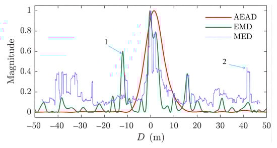 The canonical anomaly detection techniques, including the minimum information entropy (MED) [22,23] and empirical mode decomposition (EMD) [24], were used for comparison. The result obtained by the proposed AEAD processing method is shown by the red line in Figure 6, where the target signal can be clearly revealed. The peak of the red curve indicates the estimated position of the target, which was located at m, and the locating error was m. The anomaly signal was decomposed into multiple intrinsic modal functions (IMFs) with different scales by the EMD. In the simulation, eight IMFs revealed different time scales of the anomaly signal. An approximated anomaly signal was reconstructed using IMF5–Residual, as shown in Figure 6 (green line) with the estimated position of m and the locating error of m. Entropy is a basic concept of information theory, and it has been widely used in different information measurement applications [20]. The information entropy of the measured noise pattern will change when a target occurs [22]. As shown by the purple line in Figure 6, the traditional MED methods could reveal the anomaly signal with the estimated position of m and the locating error of m. However, the positions of marked-1 and marked-2 had false features of an anomaly in the outputs of the MED method and EMD. Based on the results, the AEAD method achieved better performance than the EMD and MED method under the low SNR input.