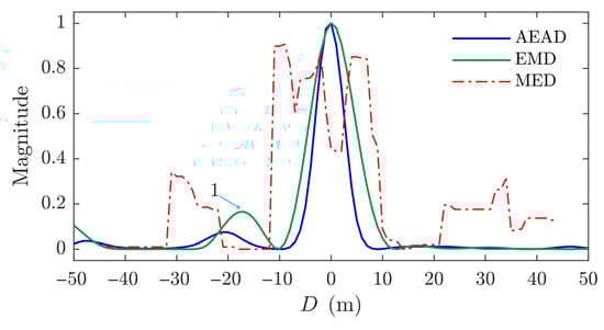 The simulation experiment results of different methods are presented in Figure 8. As shown in Figure 8, the traditional MED method (red dashed line) achieved the worst detection performance among all methods and could hardly point out the location of the anomaly target. That was because there were only 101 sample points within m, which could not reflect the true voltage probabilistic distribution. However, the proposed AEAD method and EMD method could accurately reveal the position of the anomaly target. Still, the EMD method had more obvious false features, as shown at marked-1 in Figure 8. This could lead to false alarms during the detection process, affecting the detection accuracy. Thus, compared with the EMD method, the proposed AEAD method achieved better performance in suppressing false features in target detection.