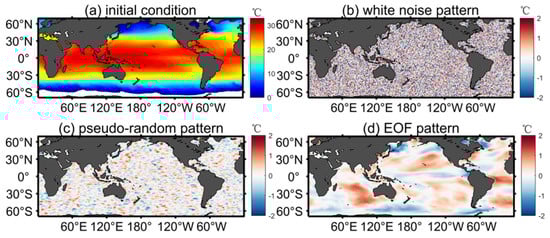 (a) SST of the initial condition which is derived from the model integrations carried out by CESM from a cold start for 100 years. The distribution of the error of the SST generated by the above three methods: (b) white noise perturbation, (c) pseudo-perturbation, and (d) EOF perturbation.