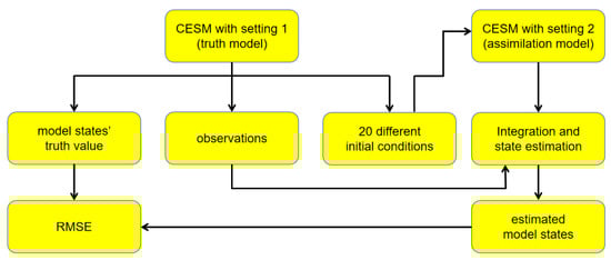 Coupled data assimilation (CDA) is a multitask problem that involves many issues: coupled model bias, sampling of the observing system, validation of the analysis scheme, etc. [24] A CDA system is complicated since any uncertainty in the aspects described above may cause the evaluation of CDA results to become extremely difficult. To reduce the complexity, this study excludes the model bias issue by using the Observation System Simulation Experiment (OSSE). The approach is to experiment with simulated data as “observations” that need to be assimilated. The Figure 2 displays a schematic diagram of the assimilation process. The data obtained from model setting 1 are used as “truth”, then, observational errors (a white noise with a standard deviation of 0.25 °C) are added to the “truth” as the observations which are assimilated into model setting 2. Then it is feasible to evaluate the assimilation quality by verifying assimilation results against the “truth”, so that any up/downgrade of the assimilation system, when a new assimilation component or observational data type is added, or when an assimilation parameter is tuned, can be quantified.