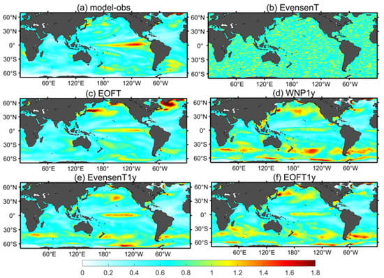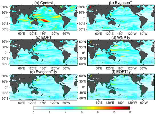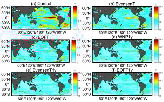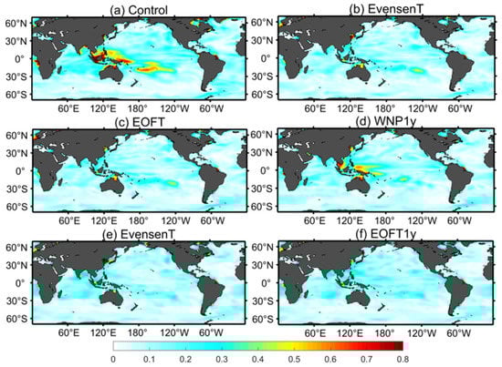 The results of the 24-month mean spatial distribution of RMSE from the various experiments are displayed in Figure 4. In addition, to avoid interfering with high latitude inaccuracies due to the model and observation deficiency, the region between 70° S and 70° N is evaluated in this work. Figure 4a is the same as Figure 3a, except that the color bar has been changed to show the effect of assimilation. It can be seen that the model’s simulations of SST in the Kuroshio Extension, tropical eastern Pacific, and high latitude in the southern Pacific and southwest of the Atlantic have considerable bias, with the maximum value exceeding 1.4 °C. In comparison to the control experiment (Figure 4a), the assimilation experiments (Figure 4b–f) show that the simulation of SST improves significantly. However, some small differences can be found in the results of the assimilation experiments, for example, the errors of the EvensenT experiment are the largest in the Eastern Equatorial Pacific, about 0.3 °C, but other experiments can even reach 0.1 °C. This is due to the fact that the perturbation of the EvensenT experiment is a pseudo-random pattern, as also mentioned in the previous chapter, which makes the standard deviation of its SST not reasonably distributed in the Eastern Equatorial Pacific (Figure 3b). Then, in the early stage of assimilation, the SST error will certainly be larger than the SST error of other experiments; therefore, such a result will be obtained after time averaging. In addition, SST assimilation improves not only areas with high bias, but also areas with low bias, such as the Indian Ocean.
