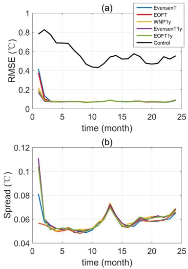 Time series of RMSE (a) and spread (b) of the SST compared with the true data for the six experiments in region (70° S~70° N, 180° E~180° W) for a two-year period.