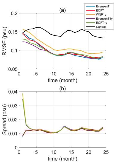 Time series of RMSE (a) and spread (b) of the SSS compared with the true data for the six experiments in region (70° S~70° N, 180° E~180° W) for a two-year period.
