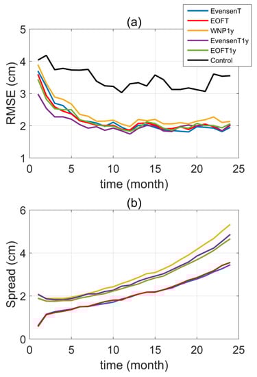 Time series of RMSE (a) and spread (b) of the SSH compared with the true data for the six experiments in region (70° S~70° N, 180° E~180° W) for a two-year period.