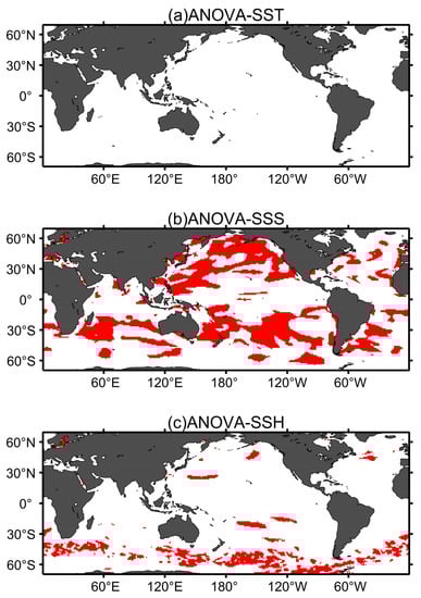 Horizontal distribution of results by ANOVA (a) SST (b) SSS (c) SSH (red: p < 0.05 white: p > 0.05).