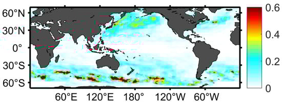 EAKF estimates the covariance between a component of a particular state variable and observation variables as the increment for that component. Covariance is a critical aspect in determining the magnitude of increments. Of course, it is not the region with high covariance that accounts for the significant difference in the simulations of the four assimilation experiments, but the difference in the covariance between SST and SSH for each assimilation experiment, which is equivalent to analyzing the spread of the covariance. As a result, prior to conducting CESM-EAKF, it is important to determine the horizontal distribution of covariance between SSH and SST. As illustrated in Figure 11, the spread of covariance between SSH and SST is greater in the Antarctic Circumpolar Current area during assimilation; this region exhibits one of the largest differences in SSH in the EAKF update. This also explains why there is a pattern of SSH in Figure 10 by ANOVA, and it demonstrates that the covariance correction in assimilation has a noticeable effect on SSH.