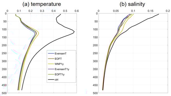 Figure 12a,b shows vertical profiles of the RMSEs of global temperature and salinity, respectively. All assimilation experiments improve the temperature simulation in the upper 500 m, with the best improvement in the mixed layer, which is reduced by about 0.4 °C. This is because the assimilation data is SST, which improves only the physical characteristics in the mixed layer. With increasing depth, the RMSE of all experiments approaches zero. As with time series analysis, all experiments are quite similar to the SST simulation and have the same effect. The largest errors are in the thermocline, about 0.25 °C, which is attributed to the substantial error in the model’s original simulation of thermocline. After all, the ocean incorporates intricate physical processes such as subsurface entrainment, which makes it difficult for models to simulate it. Additionally, the vertical distribution of temperature RMSE indicates that the WNP1y assimilation experiment has a little larger RMSE than other assimilation experiments below the surface.