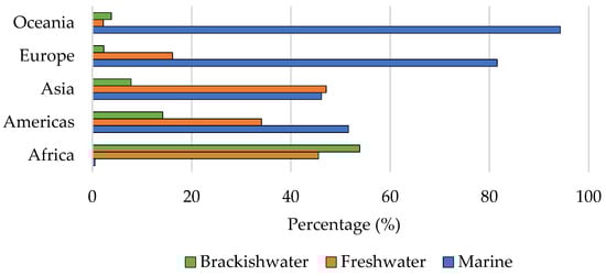 Asia is the leading continent in marine, coastal and freshwater seafood aquaculture production, both in terms of volume and estimated first-sale value, producing in 2018 about 88.7% of the total volume of aquaculture products worldwide. The Americas are the second continent with the highest production in terms of volume, accounting for 4.6% of the total aquaculture production, followed by Europe, which contributed about 3.8% of world production. Africa produced about 2.7% of the world’s farmed aquatic animals in 2018 and Oceania accounted for the production of less than 0.25% of total world aquaculture products in volume in 2018 [,]. Although Asia is the leader in aquaculture production concerning both volume and value, as mentioned above, the products farmed in The Americas and Europe especially, sustain greater market value per volume unit []. The contribution of the different types of aquaculture environment for each continent total production is represented in Figure 1.