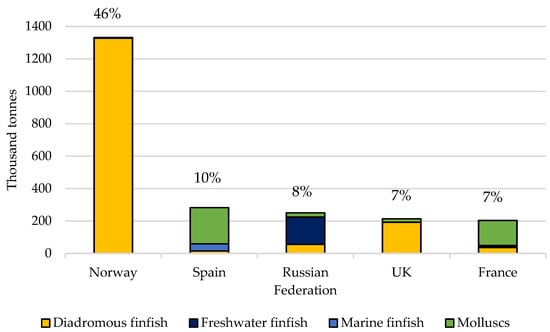 The contribution of each species’ group for aquaculture production in the main European producing countries is represented in Figure 2.