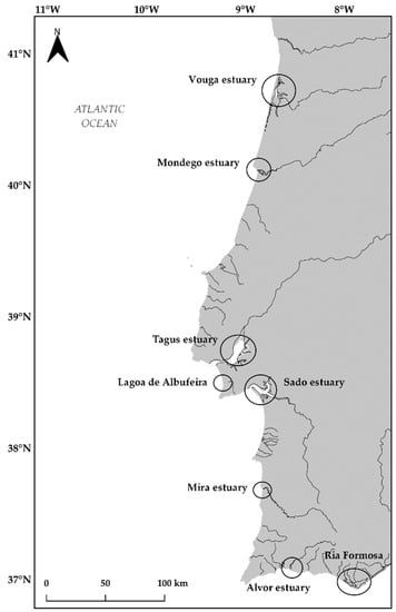 The Sado estuary, comprised between the Lisbon and Tagus Valley and Alentejo regions, has been a natural reserve since 1980, extending for about 24,000 ha, being the second largest estuary in Portugal. Most of its area corresponds to the natural reserve (about 23,160 ha), still, the estuary is subjected to many anthropogenic pressures along its margins and thereabouts, namely several industries (especially on the northern margin), including paper, fertilizers, yeast, food and naval industries, the Setúbal harbour and related activities, the city of Setúbal and copper mines by which the Sado river runs through. Furthermore, the rice fields along the estuary’s margins contribute to the input of pollutants and nutrients to the system. Despite all the pressures stated, the Sado estuary is still very suitable for salt and aquaculture productions [,].