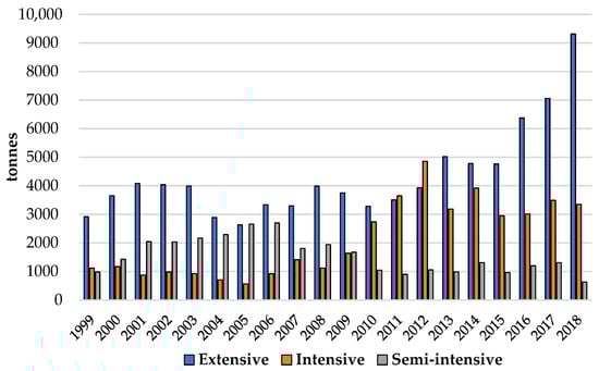 For the time frame issued in the present work, extensive aquaculture production has oscillated somewhat over the years but has always maintained high production numbers, consisting almost exclusively of the rearing of molluscs. Production in semi-intensive systems, especially aimed for the production of fish, has suffered noticeable changes over the years: for example, the break in the production in semi-intensive systems between 2008 and 2011 was probably due to the conversion of semi-intensive facilities for the rearing of fish in units aimed for mollusc production in extensive systems [,,,], at the same time that intensive methods were preferred for the rearing of fish. The contribution of extensive, semi-intensive and intensive aquaculture rearing systems for aquaculture production in Portugal is shown in Figure 4.