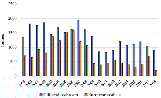 Gilthead seabream was the most cultured marine fish species in Portugal until 2010 when the production of turbot peaked. Seabream is a highly appreciated species in the Portuguese markets and is often reared in polycultures, especially with seabass, which has proven to be very effective []; since 2010, it has been the second most cultured species in the country, and the most cultured in coastal aquaculture. European seabass is one of the most appreciated fish species in Portugal and is essentially cultured in semi-intensive systems, usually in polycultures with gilthead seabream as mentioned above, being the third most cultured fish species in Portugal. The production numbers of both species over the years are represented in Figure 5.