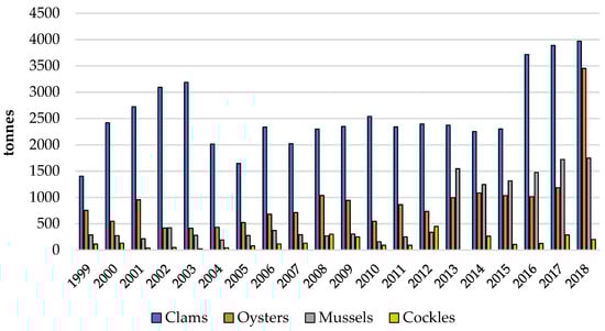 Bivalve molluscs represent a little over 67% of the total aquaculture production in Portugal []. The most produced species is the clam (Ruditapes decussatus, Linnaeus 1758), accounting for about 42.2% of the total mollusc production, followed by mussels (Mytilus spp.) and oysters (combined production of Portuguese oyster Crassostrea angulata Lamarck, 1819, European flat oyster Ostrea edulis Linnaeus, 1758 and Pacific cupped oyster Magallana gigas Thunberg, 1793). The production of the main mollusc species produced in the time frame issued is represented in Figure 6.
