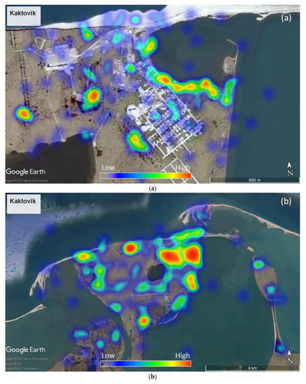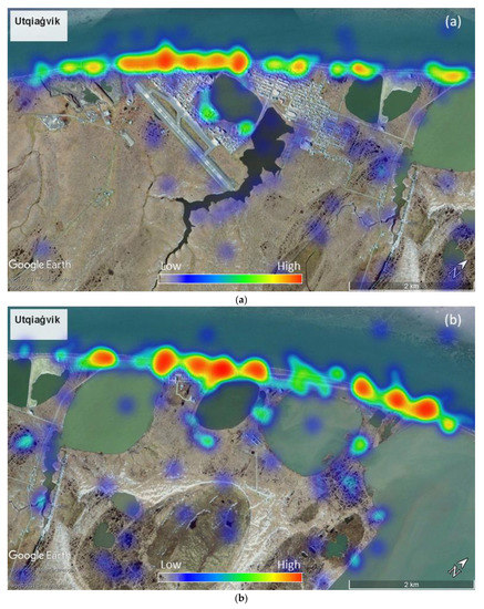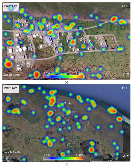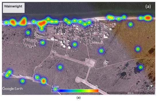 Permafrost thaw and coastal erosion are two land degradation processes driven by climate warming. Although each community is affected by both permafrost thaw and coastal erosion, the extents of the processes vary across the four communities. In this study, survey participants provided locations where coastal erosion and permafrost thaw were observed. Figure 11, Figure 12, Figure 13 and Figure 14 show the heatmaps of permafrost-thaw-induced ground surface disturbance and coastal erosion in Utqiaġvik, Kaktovik, Wainwright, and Point Lay, respectively. The heatmaps are created by stacking map locations or coordinates marked by the participants. Locations with the highest frequency of participants’ selections are shown in red, and those with the lowest frequency are shown in blue.
