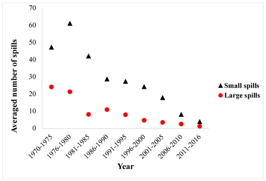 Averaged number of global oil spills from tankers from 1970–2016 [2].