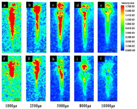 Mineral particles play a key in the formation of OMA. Stoffyn-Egli and Lee (2002) observed that quartz and kaolinite give mostly droplet OMA, while montimorillite only forms flake aggregates. They concluded that the type of minerals determined the OMA type formed [63]. Other observations suggested that smaller grain sizes and higher concentration of mineral particles favor OMA formation by coating the oil droplets [64]. Wang et al. [65] studied the evolution of uprising oil droplets and the interaction between oil and kaolin particles of different levels hydrophobicity using particle image velocimetry (PIV). Figure 6 shows that the rising oil droplet was surrounded by a large amount of the modified kaolin particles with higher hydrophobicity compared to the original kaolin particles, which had a hydrophilic surface. This indicated that modified kaolin particles had stronger interaction with the rising oil droplets.