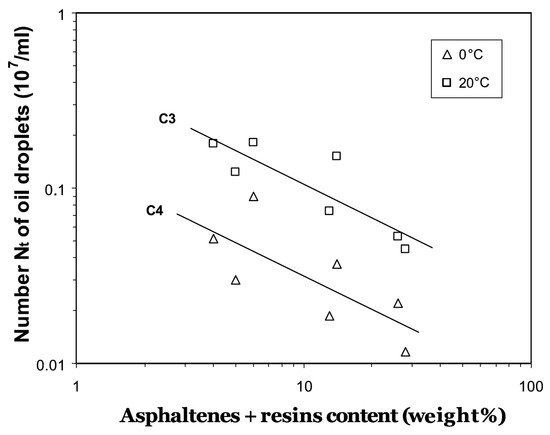 Variations of number concentration of OMA with asphaltenes + resins content (ARC) (extracted from Khelifa 2002) [67]. (Copyright 2002 Elsevier Ltd.).
