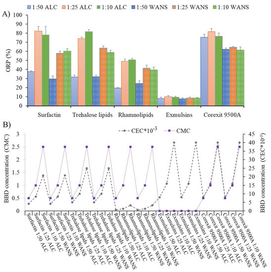 Oil dispersion effectiveness of BBDs. (A) ORP (oil-removal performance) (%) of various BBDs used at three DORs (dispersant-to-oil ratios) against ALC (Arabian light crude oil) and WANS (weathered Alaska North Slope crude oil) in BFT (Baffled Flask Test); (B) concentrations of BBDs in terms of unit CMC (critical micelle concentration) or unit CEC (critical emulsion concentration) in each BFT [74]. (Copyright 2016 Elsevier Ltd.).