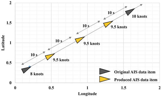 - AIS data items were added by dividing the straight line of the linear interpolation between the two locations of AIS items in the interval of 10 s, and the average ship speed of the two AIS data items were inputted along the straight line. Figure 3 shows an example of the process.