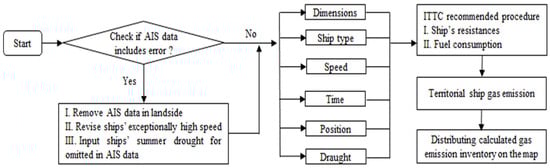 Figure 4 illustrates the process of the bottom-up methodology using AIS data to estimate gas emission of ships underway using their engine. Three items, such as ship’s position, speed, and draught, in the AIS data were preprocessed as the first step to revise their error values [8]. The total resistance was calculated according to the proposed methodology by the International Towing Tank Conference (ITTC) as the second step [43,44]. The fuel consumption was calculated according to the specific fuel oil consumption (SFOC). Table 4 shows SFOC by engine age. Table 4 shows that the efficiency of the engine decreases age [13]. The quantity of a ships’ emissions is estimated based on the emission factors of each emission pollutant as shown in Table 5.