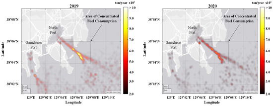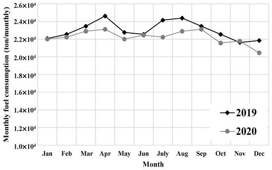 In 2019, 21.2%, and, in 2020, 18.9% of the fuel consumption in BP were concentrated on the passageway to NP as shown in Table 6. Figure 5 clearly shows the concentrated fuel consumption at the passageway to the NP and GP in both years. This indicates that ships normally increased their speed along the passageway. In the view of the resolution along the passage of the NP and GP in Figure 5, the NP has a higher resolution than NP. It clearly explains the higher traffic in the NP than GP according to the AIS data. As shown in Figure 5, compared to the results for 2019, the annual fuel consumption in most of the analysis domain areas in 2020 relatively decreased. It could be considered due to the efficiency of the VSR programs, because ships’ speed was the main increase factor or the high fuel consumption. In the trend line of the monthly fuel consumption, there was no severe fluctuation in both years as shown in Figure 6. In particular, the monthly fuel consumption relatively decreased from October to December in both years.