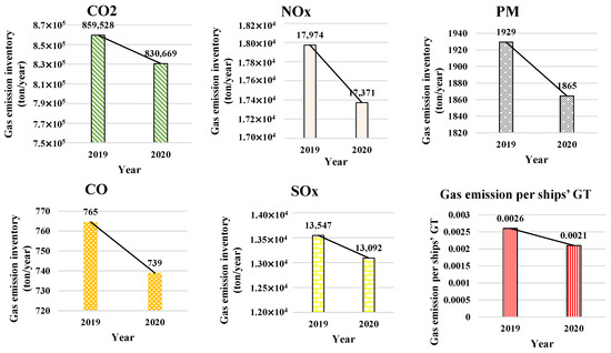 Gas emission inventory and gas emission per ships’ GT in 2019 and 2020.