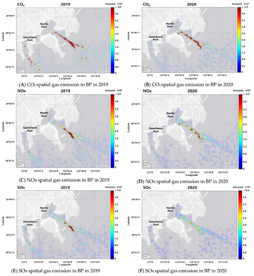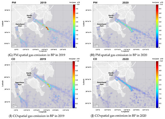 Figure 8 illustrates the annual spatial distribution of five air pollutants in BP in 2019 and 2020. The gas emissions of the five air pollutants are roughly distributed along the berthing line and the passageway of BP in both years. Comparing two ports between the NP and the GP, it can be easily confirmed that the gas emissions were more distributed at the NP, because the main role of the GP is for fishing vessels, reefers, and relatively small general cargo ships. In terms of the high concentration areas of the gas emissions in both years, the five air pollutants were highly distributed along the passageway between the port to the ocean at the NP, because ships increase their speed along the passageway during arriving or denaturing in the BP. In terms of these results, an improvement of the VSR programs is required to mitigate the concentrated gas emission along the passageway.