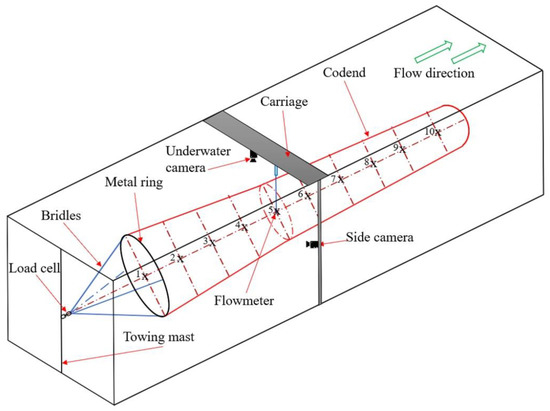 A total of 10 measurement points were identified along the length of the codends (Figure 1). The distance between each position was 1.5 m. Measurement points were selected and marked prior to deployment in the flume tank. The first measurement point was set as a reference; no data were collected at this point. Measurement points 2 to 6 belonged to the extension piece, while measurement points 7 to 10 belonged to the codend section. A downward looking underwater camera (Sony FCB-ER8300, Minato, Tokyo, Japan) was used to determine the horizontal spread of the codend at each measurement point. A side-looking camera (Panasonic MDV12885, Kadoma, Osaka, Japan) perpendicular to the flume tank window was used to measure the vertical spread at each of the same measurement points.