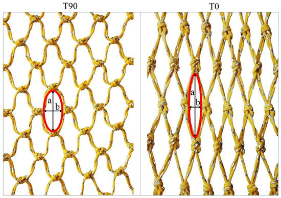 Mesh shape fitted with an ellipse. The letter a indicates the length of major axis of the fitted ellipse; b is the minor axis. CircT90 = 0.74; CircT0 = 0.33.