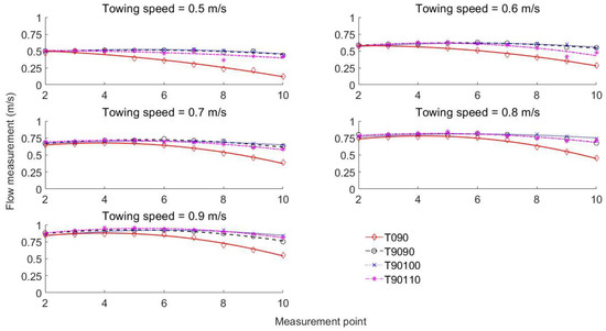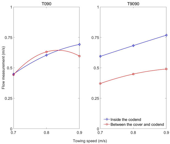Our first experiment examined the hydrodynamics of the four codends without a cover. Towing speeds ranged from 0.5 to 0.9 m/s at increments of 0.1 m/s. At each towing speed, the mean flow velocity through the center of each codend was measured at the different measurement points.