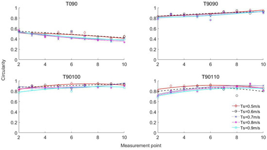 Mesh circularity from the beginning to terminal end of each codend, where the line represents the fitted model and the marker is the mean of the measured value. Ts is towing speed in m/s. The codend starts at point 7.