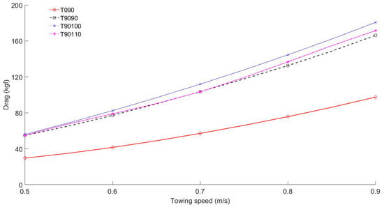 The total drag of each codend (with the simulated catch) at different towing speeds is shown in Figure 6. The drag of each codend increased with increasing towing speed, as expected. At a towing speed of 0.5 m/s, the difference in drag between the T0 and T90 codends was approximately 25.3 kgF. This difference increased to 75.0 kgF when the towing speed increased to 0.9 m/s. The curve for the T0 codend was noticeably lower than that for the T90 codends (Figure 6). The regression analysis showed that the drag of T90 codends was significantly higher than that of the T0 codend (p < 0.001; Table 4).
