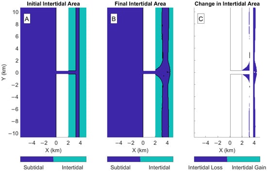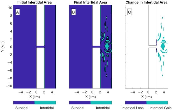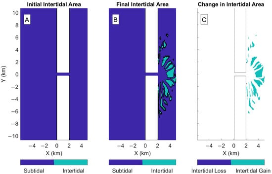 - van Maanen, B.; Coco, G.; Bryan, K.R. Modelling the effects of tidal range and initial bathymetry on the morpho-logical evolution of tidal embayments. Geomorphology 2013, 191, 23–34. [Google Scholar] [CrossRef]
