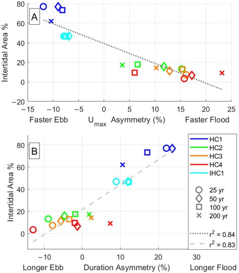 3.3.2. Tidal Asymmetry vs. Intertidal Area