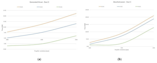 The curves in the graphs shown in Figure 9 show that, for all the proposed units except the LIVT duct, speed is limiting. Units with Ducts 5 and 6 start to generate thrust in the working area of the propeller, at 1500 rpm. The propulsion with Duct 3 is worse, as it needs a relatively high speed to create a thrust. The duct formed in this way generates more resistance at this speed. The performance characteristics of the LIVT duct propulsion unit are shown in Figure 10.