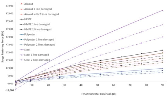 - The mooring system restoring force increased significantly with increasing mooring material stiffness, and a higher material stiffness led to a higher loss in restoring force in the case of single-line failure. In the case of double-line failure, the percentage reduction in restoring force was within the same range for all materials considered. Thus, in terms of percentage loss in restoring force, the polyester line was the best choice.