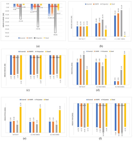 - In intact conditions, material stiffness had a significant influence on the surge response for all mooring materials considered. In addition, lines with higher material stiffness had higher heave responses. In this regard, in a case where a reduction is surge and sway is the primary objective, the steel wire would be the best choice.
