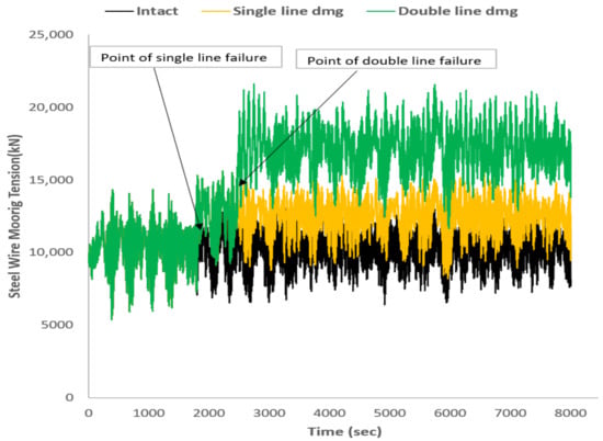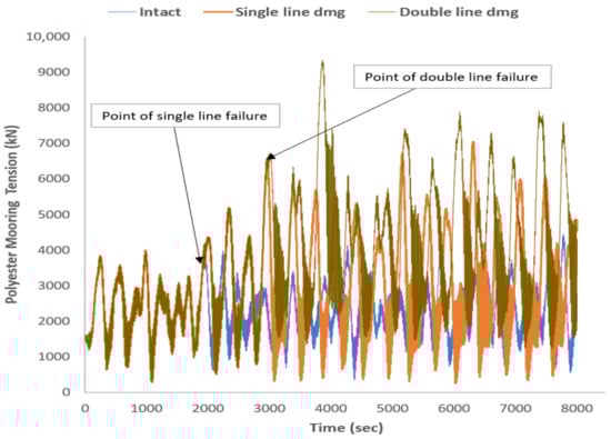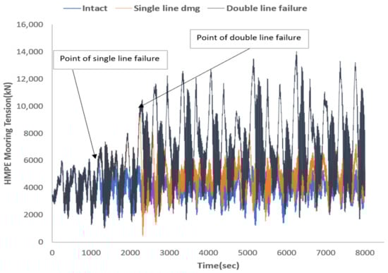 - Lian, Y.; Liu, H.; Zheng, J. Numerical investigation on dynamic responses of HMPE mooring system with damaged lines. In Proceedings of the 27th International Ocean and Polar Engineering Conference, San Francisco, CA, USA, 25–30 June 2017; International Society of Offshore and Polar Engineers: Mountain View, CA, USA, 2017. OnePetro. [Google Scholar]