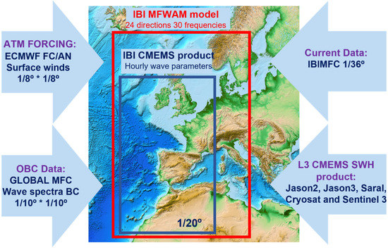 The MFWAM model configuration for IBI MFC is implemented on the IBI domain (26–56° N and −19–5° E; see geographical domain in Figure 1) with a horizontal resolution of 5 km approximately (1/20°).