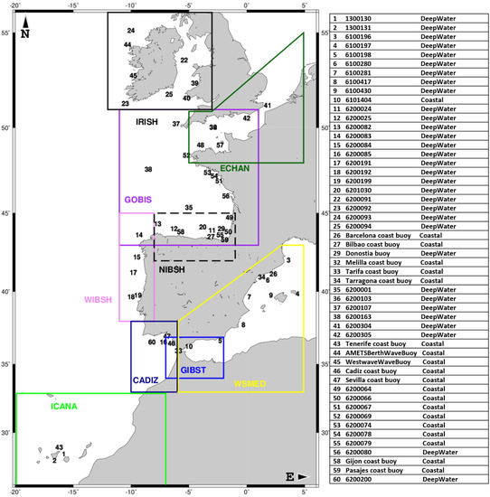 Specifically, for the European Atlantic Façade, the Copernicus Marine IBI-MFC (Iberia–Biscay–Ireland Monitoring Forecasting Centre) delivers daily ocean model estimates and forecasts of different physical and biogeochemical parameters, including, since 2016, hourly wave forecasts and multi-year products [25].