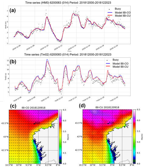 Typical time series of significant wave height (a) and mean period (b) at the buoy 6200083 for a period of 2 weeks (5–12 December 2018). The observed values are represented by the black dots. Two model results are shown, one including current coupling (red line, IBI-CU) and the other without currents (blue, IBI-CO). On the bottom, example of the modeled situation at 18:00 UTC 9 December 2018 for the western coast of Galicia for the coupled model, IBI-CU (d) and no coupled model, IBI-CO (c). Point B14 is the location of the buoy 6200083.