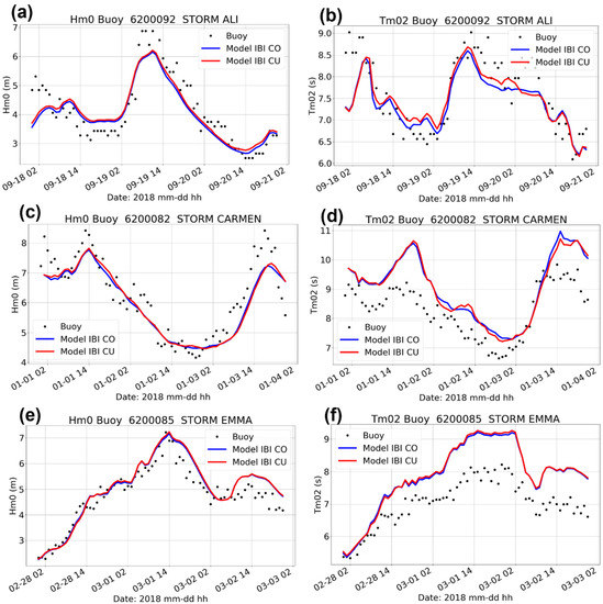 Comparison of coupled model IBI-CU, (red line) and no coupled, IBI-CO (blue line) against mooring buoys for different Storms: Ali ((a) Hs and (b) Tm02 at buoy 620092 on Irish coast), Carmen ((c) Hs, (d)Tm02 at the buoy 6200082, Gijon coastal buoy at Cantabrian Sea) and Emma ((e) Hs, (f) Tm02 at buoy 620085 in Gulf of Cadiz). The observed values are represented by the black dots.